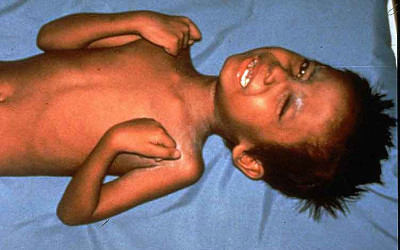 - Cứng cơ, bắt đầu ở hàm, sau đó đến cổ và cánh tay, chân hoặc bụng.