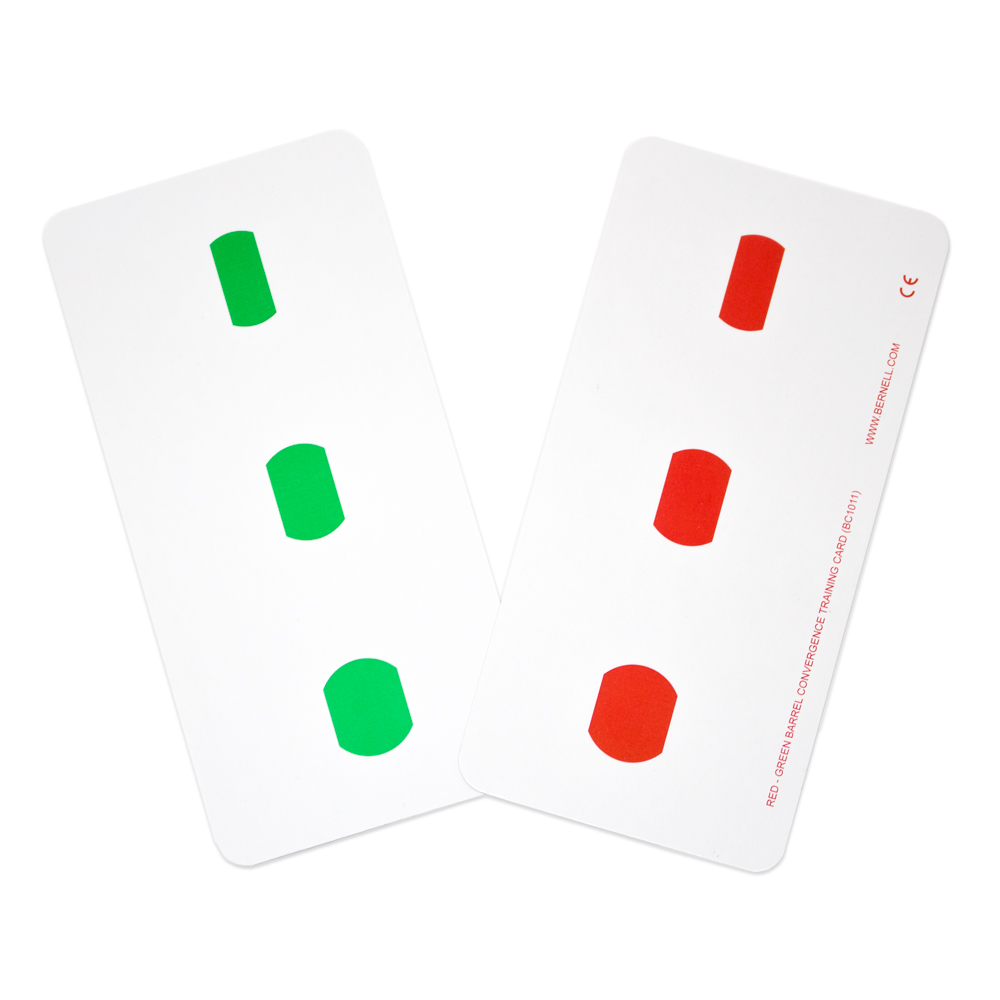 Để tạo thẻ khối màu hội tụ, hãy vẽ khối màu màu đỏ trên một mặt của thẻ theo chiều dọc. Các khối sẽ tăng kích thước về phía dưới cùng của thẻ. Vẽ các khối màu tương ứng trên mặt còn lại của thẻ bằng màu xanh lá cây. Để sử dụng thẻ khối màu hội tụ cần:
