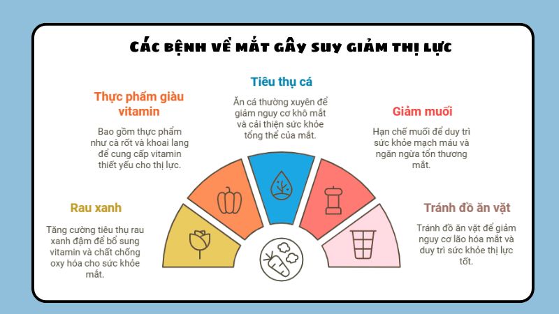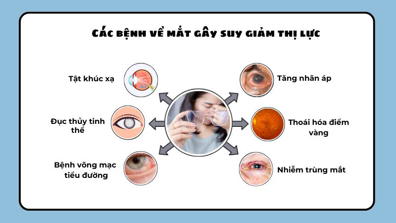 Suy giảm thị lực thường xuất phát từ các bệnh như đục thủy tinh thể, tật khúc xạ, hoặc các vấn đề khác như khô mắt hay viêm kết mạc.