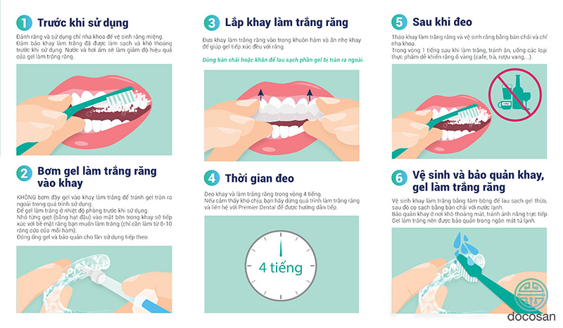 - Thời gian đeo: Thời gian để đeo khay làm trắng răng là 4 tiếng đồng hồ.