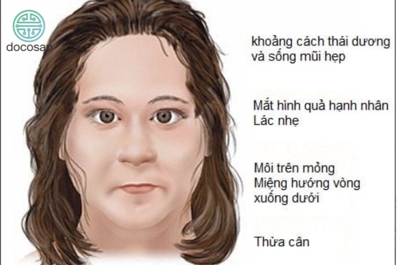 - Gương mặt đặc trưng: gương mặt trẻ mắc căn bệnh này đặc trưng với đôi mắt hình hạnh nhân, đầu hẹp ở thái dương, miệng quay xuống dưới và có môi trên mỏng.