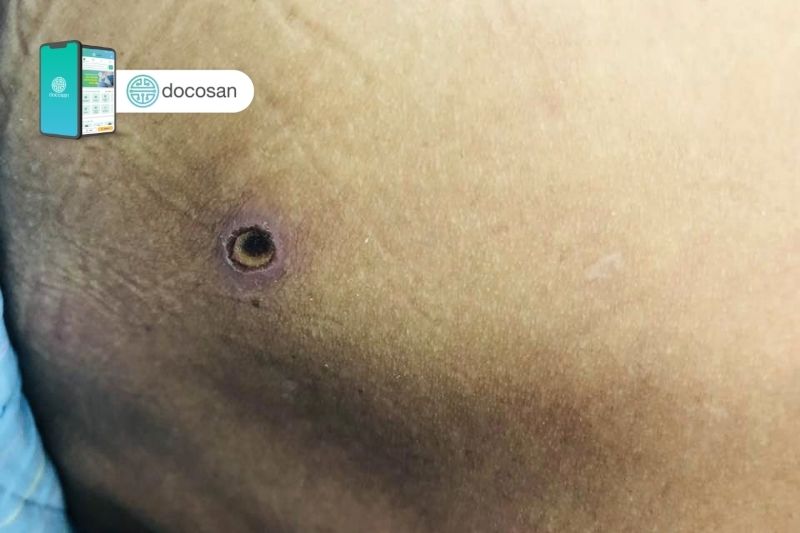 - Vết loét ngoài da đen hoặc đã bong vảy, không tiết dịch, không đau, khu trú ở vùng da mềm như bẹn, bụng, ngực,…